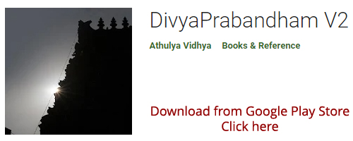 Athulya Vidhya is a humble initiative with an intent to reach 4000 Divya Prabandham to our younger generation with the help of technology. With the blessings and guidance of our Aachariyan His Holiness Thirumalai Ananthaanpillai Shri.Ranganathachar Swamy, our first android application “Divya Prabandham” was launched by Swamy in 2016. With the overwhelming response and suggestions from the users, an upgraded version “Divya Prabandham V2” was launched in 2019.